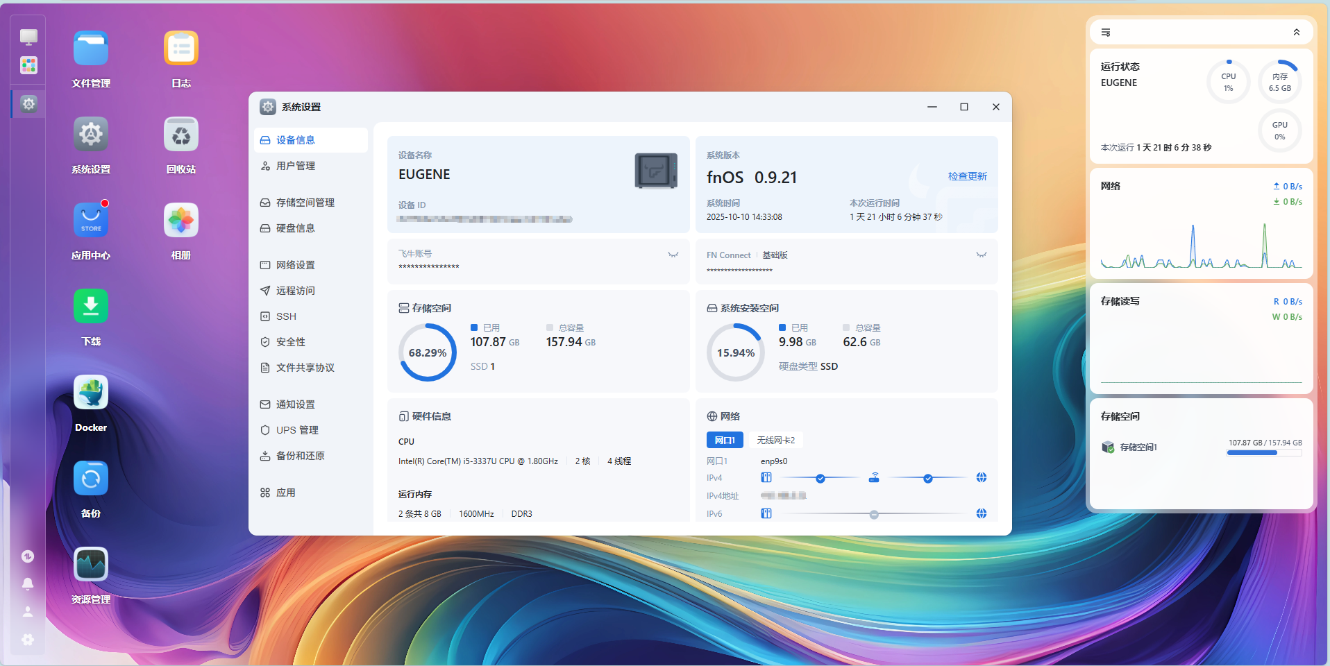 进入操作界面非常的丝滑,UI颜值十分在线,并且当我发现里面还有docker这类工具时,不由的佩服这个产品的作者,给这个操作系统带来更多的可玩性,它不仅仅是一个存储服务器。